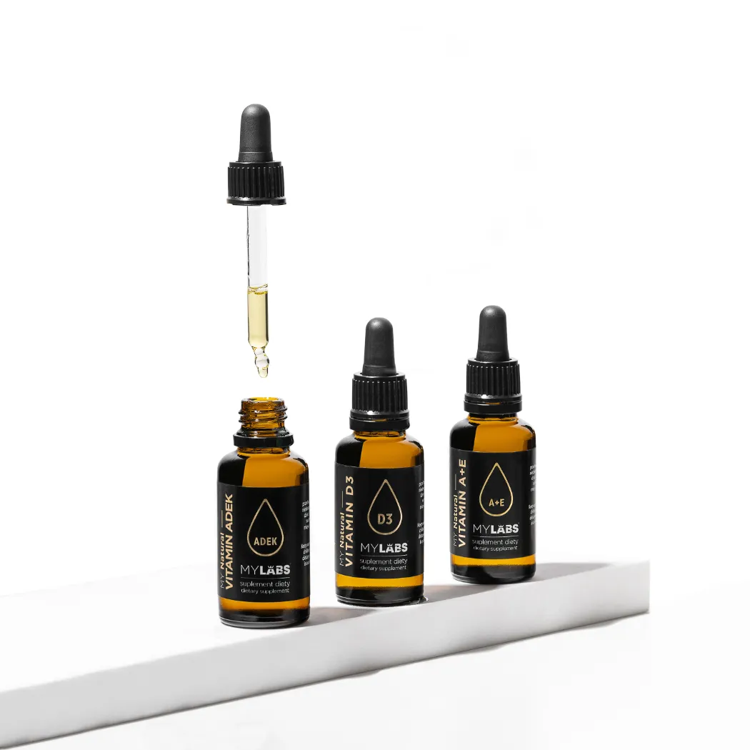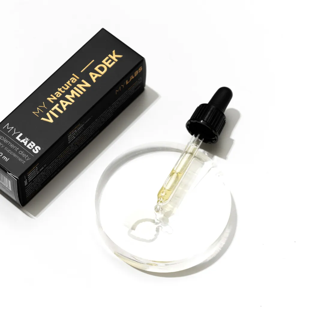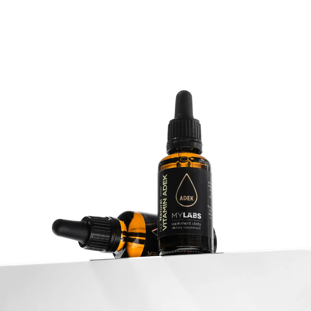 MY Natural VITAMIN ADEK to kompleksowy suplement diety zawierający naturalne witaminy A, D, E i K rozpuszczone w oleju MCT, co zapewnia ich optymalne wchłanianie. Produkt odpowiedni dla wegetarian.