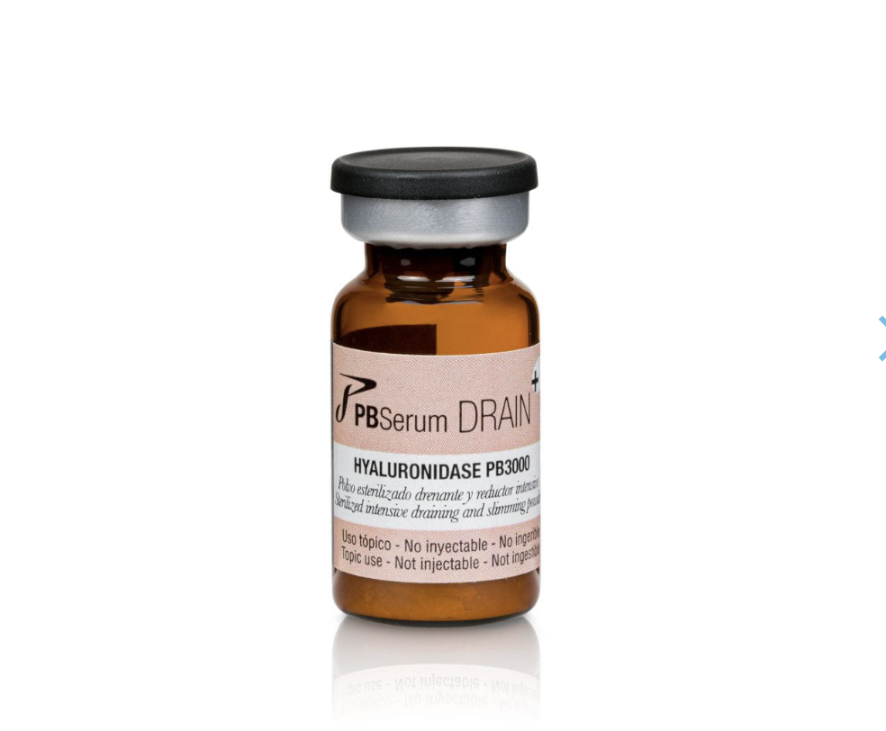 PBSerum Drain+ Hialuronidaza PB3000 to preparat enzymatyczny stosowany w medycynie estetycznej, zawierający hialuronidazę odpowiedzialną za hydrolizę kwasu hialuronowego pochodzenia naturalnego oraz stosowanego w wypełniaczach. PBSerum Drain+ znajduje zastosowanie w korekcie nieprawidłowo podanych wypełniaczy, redukcji obrzęków, wsparciu lipolizy oraz terapii cellulitu. Enzym zwiększa przepuszczalność tkanek i wspomaga rozprzestrzenianie się innych wstrzykniętych substancji.