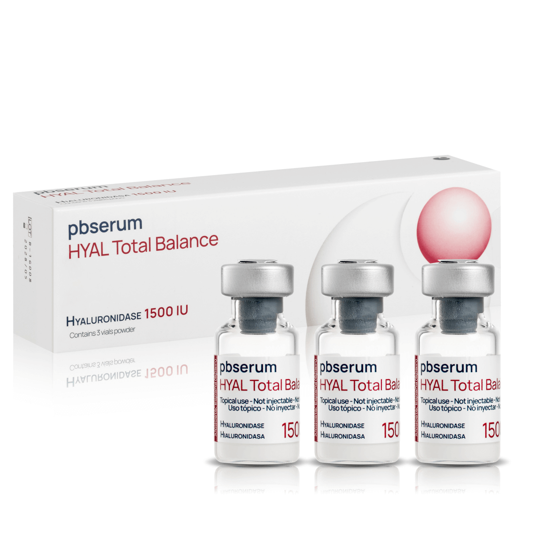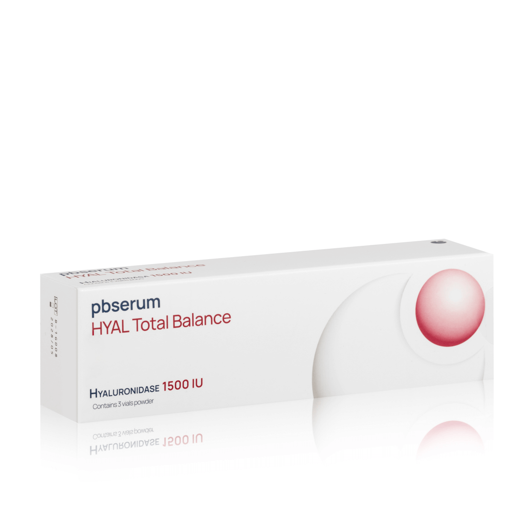 Preparat marki PBSerum pozyskiwany jest z Streptococcus pyogenes i klonowany bezpośrednio w bakteryjnym DNA, co zapewnia wysoką czystość oraz bezpieczeństwo stosowania bez ryzyka reakcji immunogennej. W praktyce gabinetowej Pbserum HYAL Total Balance wykorzystuje się do przywracania równowagi skórnej, poprawy penetracji składników aktywnych i przygotowania skóry do kolejnych zabiegów, a w przypadku powikłań związanych z nadmiarem, przemieszczeniem lub niewłaściwym podaniem wypełniacza – do całkowitej, kontrolowanej eliminacji materiału z wybranych obszarów. Produkt występuje w postaci liofilizatu 1500 UI, przeznaczonego do rekonstytucji bezpośrednio przed użyciem zgodnie z protokołem.