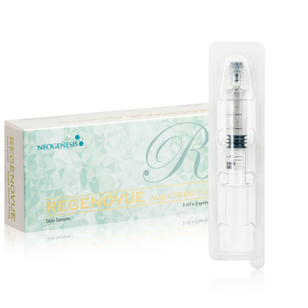 Regenovue AquaShine+ to preparat do mezoterapii o działaniu biorewitalizującym, stworzony z myślą o zabiegach poprawiających kondycję skóry twarzy i ciała. Produkt zawiera zmodyfikowaną formę lekko usieciowanego kwasu hialuronowego o stężeniu 15 mg, dzięki czemu zapewnia dłuższe utrzymywanie się w górnych warstwach skóry i skuteczniejszy efekt nawilżenia. Preparat dedykowany jest do stosowania w zabiegach estetycznych ukierunkowanych na wygładzenie, rozświetlenie oraz poprawę jędrności skóry.