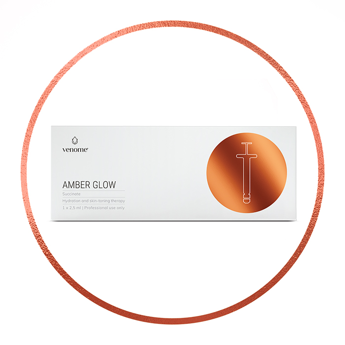 Venome Succinate Amber Glow to preparat ukierunkowany na intensywną regenerację skóry, rozjaśnianie przebarwień i wyrównanie kolorytu. Formuła łączy kwas bursztynowy, fragmentaryczny kwas hialuronowy, kompleks inhibitorów tyrozynazy (niacynamid, glutation, kwas traneksamowy), ekstrakt z szafranu oraz aminokwasy (glicynę i prolinę). Połączenie tych składników wspiera mikrokrążenie i dotlenienie tkanek, ogranicza stres oksydacyjny, wzmacnia barierę ochronną i poprawia sprężystość. Venome Succinate Amber Glow jest projektowany do pracy na obszarach twarzy, szyi, dekoltu i dłoni, gdzie celem jest redukcja nierówności pigmentacyjnych, przywrócenie naturalnego blasku oraz poprawa elastyczności. Fragmentaryczny kwas hialuronowy aktywuje fibroblasty (CD44), co koreluje z poprawą gęstości i jędrności, a inhibitory tyrozynazy wspierają równoważenie syntezy melaniny. Regularna terapia w seriach pozwala na widoczne uporządkowanie kolorytu, lepsze nawilżenie i bardziej harmonijny wygląd skóry. Venome Succinate Amber Glow przeznaczony jest wyłącznie do zastosowań gabinetowych.